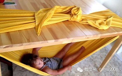 这个聪明的玩法小孩子的父母可以借鉴,床单+桌子就是孩子天然的摇椅,乐趣十足。
