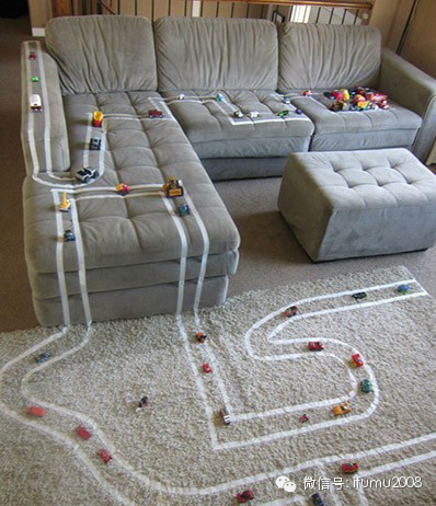 这个玩法依然与胶条有关,找一个家里的过道,将胶条悬空随意贴成若干轨迹,孩子们将手中的小车或者小人偶扔出,如何能让它们通过障碍而不被粘住,要考验小朋友的手眼协调能力了,哈哈,这个游戏是不是让成人也很心动?