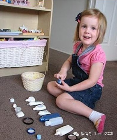 8. 找瓶盖:家里不用的小瓶子,小盒子 一 定很多吧,把它们的瓶盖和瓶身分开, 让孩子们自己去进行配对,很培养孩子的细心观察能力。