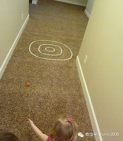 在地板上设置一个区域做为目的地,让孩子在一定距离外用小手将小球推动,看看小球能否停留到目的地,可以将目的地分区域设置得分,全家一起来玩,看看最后谁的得分最高。