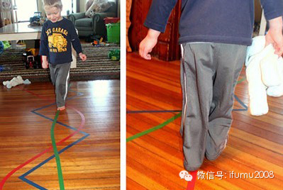 依然是胶条,父母在地板上贴出任意的几条路线,让孩子们按照轨迹去行走,可以培养他们的平衡能力哦,大一点的孩子可以用吸管吹球,让小球按照轨迹行进,也是非常好玩的游戏。