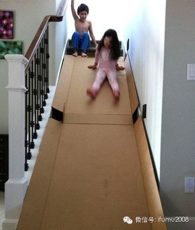 2. 纸箱滑梯:家里有楼梯的可以试下这个玩法,孩子们一定 乐此不疲!