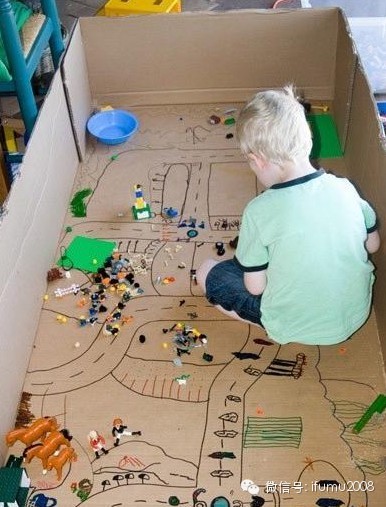9. 大纸箱游乐场:将家里不用的大纸箱取出来,让小朋友自己来绘制一个游戏场,将小脑袋里想像的情景都实现出来,再把乐高小人或者小玩偶都拿来,在自己创造的游戏场里玩情景游戏,充满乐趣。